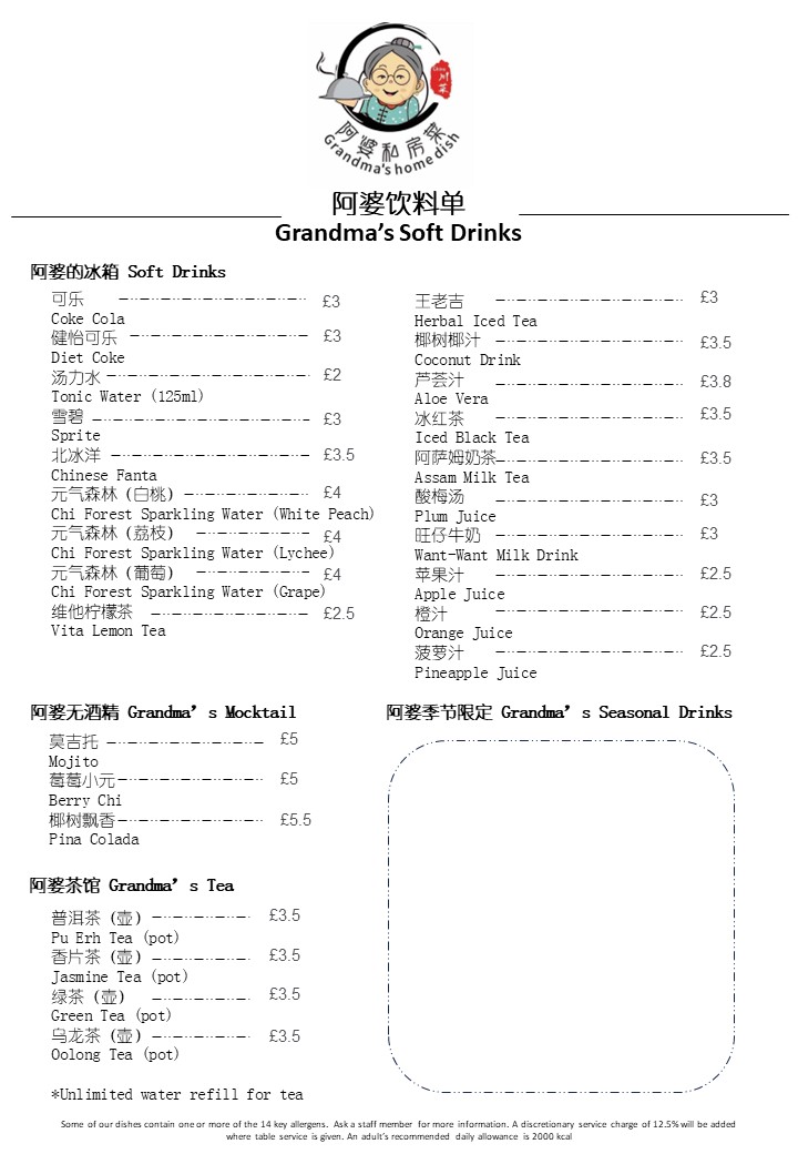 Step into Grandma's Food & Bar 阿婆私房菜, a gem located in Wembley Park, London. This Chinese restaurant brings warmth and authenticity to each dish, inviting you to enjoy a delightful culinary journey. With a diverse menu that highlights rich flavors and traditional cooking styles, you’ll discover something for every palate.
